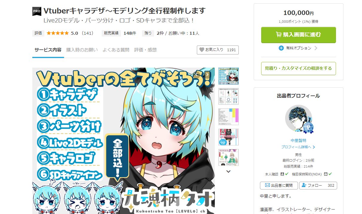 キャラデザ、全身イラスト、パーツ分け、モデリング、キャラクターロゴ、ロゴマーク、SDキャラクター、チャンネルアートなどの一括パックということで初心者の方でも安心して依頼できるでしょう。またプランがいくつか用意されているため、ご自身の求める作業に応じて依頼可能なのも嬉しいポイントです。これまでの対応件数も100件を超えており、特にオススメのモデラーさんになります!